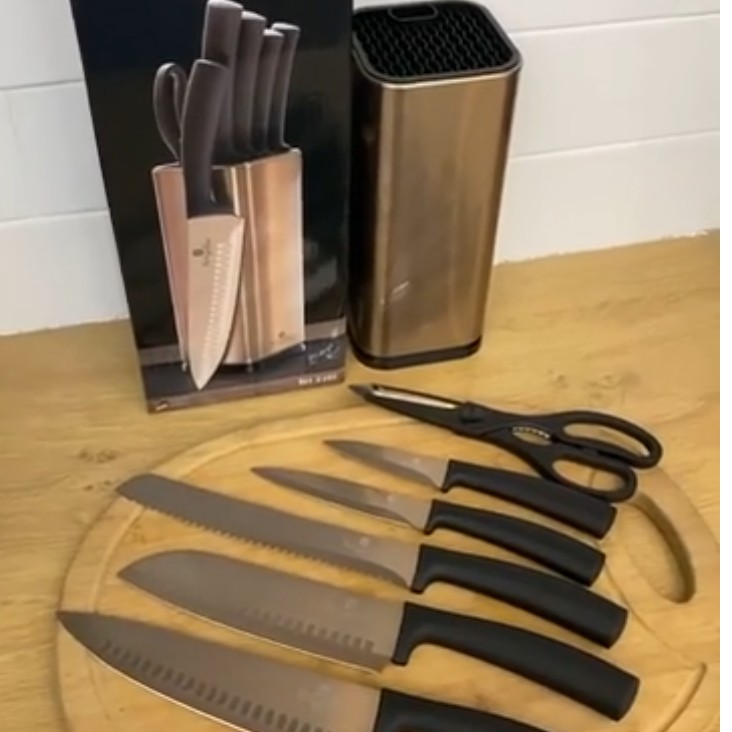 ️Berlinger Haus 7 Pcs Knife With Stand Rose Gold️.Menyiapkan bahan masakan jadi lebih mudah dan praktis dengan Berlinger Haus 7 Pcs Knife With Stand Rose Gold..Pisau set masa kini yang paling dibutuhkan untuk memasak dan mengolah bahan masakan sehari-hari.Dengan mata pisau dari bahan stainless steel, Berlinger Haus 7 Pcs Knife With Stand Rose Gold bisa jadi pilihan Anda karena kualitas eksklusif, desain elegan, dan simple...⚔️Keunggulan produk:⚔️1. Antibakteri2. Tidak Meninggalkan Noda3. Nyaman Digenggam4. Design Elegan dengan warna Rose Gold5. Free PFOA, LEAD, CADMIUM..*1 setBerlinger Haus 7 Pcs Knife With Stand Rose Gold, terdiri dari:*1 pc Pisau Serbaguna, ukuran 20 cm : Jenis pisau dapur yang serbaguna karena dapat digunakan untuk memotong apa saja1 pc Pisau Roti, ukuran 20 cm : Jenis pisau ini digunakan untuk mengiris roti secara sempurna tanpa membuatnya hancur1 pc slicer knife , ukuran 20 cm : Jenis pisau dapur ini lebih berguna untuk mengiris daging atau ikan yang super tipis karena memiliki mata pisau yang lebih tajam1 pc Utility Knife, ukuran 12,5 cm : Jenis pisau ini dapat digunakan untuk segala potongan yang tidak terlalu sulit serta sampai ke tingkat yang sulit1 pc Paring Knife : dapat digunakan untuk mengupas buah, memotong sayuran dan memisahkan kulit udang. Uniknya, jenis pisau dapur ini dapat juga dipakai untuk menghias makanan.1 pc Gunting...️Petunjuk penggunaan:️‼️Produk yang tajam, hati-hati pada saat pemakaian dan pada saat penyimpanan‼️Gunakan sesuai fungsinya, untuk dapur rumah tangga‼️Hati-hati saat menggunakan pada bahan kerasCuci dan keringkan dengan lap kering dan lembut, sebelum disimpan‼️Jauhkan dari jangkauan anak-anak‼️Jauhkan dari api.. ️PACKAGING️Ukuran : 230 x 370 x 100Berat Real : 1.