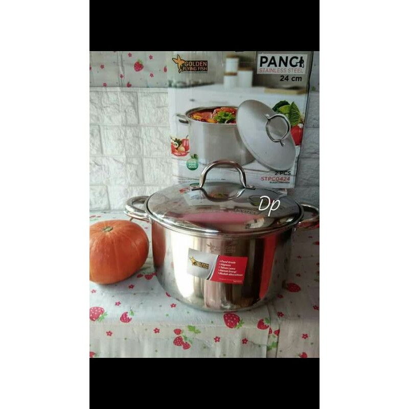 Deskripsi Panci Stainless Steel 24 CM Merk Golden Flying Fish STPC 0424Panci Food Grade.Panci stainless steel 24cm STPC0424 – Golden Flying Fish (dengan tutup full stainless steel).Hemat energi karena panas merata, mudah dibersihkan, lebih kuat, tebal, dan tahan lama. Tidak mengubah rasa atau menimbulkan reaksi kimia pada makanan. Diproduksi di Indonesia dengan material stainless steel food grade dan ber-SNI (Sertifikat Nasional Indonesia).Ukuran Diameter : 24 cmUkuran Lebar Dengan Kuping : 34.5 cmUkuran Tinggi Keseluruhan :