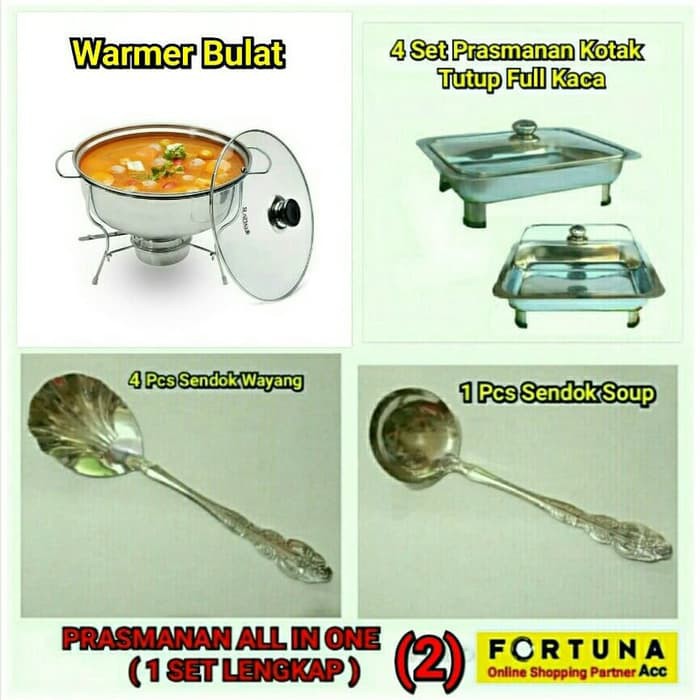 *Untuk kenyamanan transaksi anda..luangkan sedikit waktu anda untuk membaca ( Catatan,Kebijakan dan Aturan main toko ) Agar tidak ada keraguan dalam ber transaksi.*Jadikan " Fortuna Acc " sebagai toko favorit anda untuk memudahkan pencarian / update promo produk terbaru dari kami.------------------------------------------------------------------------------------------------------------------------------------------------------------Tentang Produk :Prasmanan set serba guna ini terbuat dari stainless yang berkualitas serta dilengkapi tutup kaca yg memudahkan anda melihat isi wadah tanpa membuka tutupnya.Terdapat pula kaki yang bisa dibongkar pasang sesuai dengan kebutuhan.Sangat cocok digunakan untuk acara pesta di rumah.Paket 1 Set Prasmanan sbb:* 1 Set Warmer Bulat* 4 Set Prasmanan Kotak Tutup Full Kaca* 4 Pcs Sendok Wayang Ceper* 1 Pcs Sendok Wayang Soup(Atau sprti di gambar ke 1 )Berat: -/+8000g (Hitung Volume)NOTE: HARAP DI PERHATIKAN...!!!*SEBELUM DI KIRIM BARANG DI PASTIKAN 100% OK / TIDAK RUSAK/PECAH DLL..Sebaiknya tambahkan ''PACKING EKSTRA AMAN'' dalam daftar belanja anda atau ADD :*Kami tidak bertanggung jawab terhadap barang/kiriman jika terjadi kerusakan dlm proses pengiriman..*Tidak terima komplain brg rusak/pecah belah/human eror dll sebaiknya asuransikan dlm pengiriman ny..*Motif produk/bentuk/packing tidak selalu sama dgn pict promo...semua akan disesuaikn dgn kebutuhan produksi/pasar..harap dipahami..!!!ORDER = SETUJU#warmer #warmerbulat #baskom #wadahsaji #tempatsayur #tempatsoup #prasmanan #fastfoo