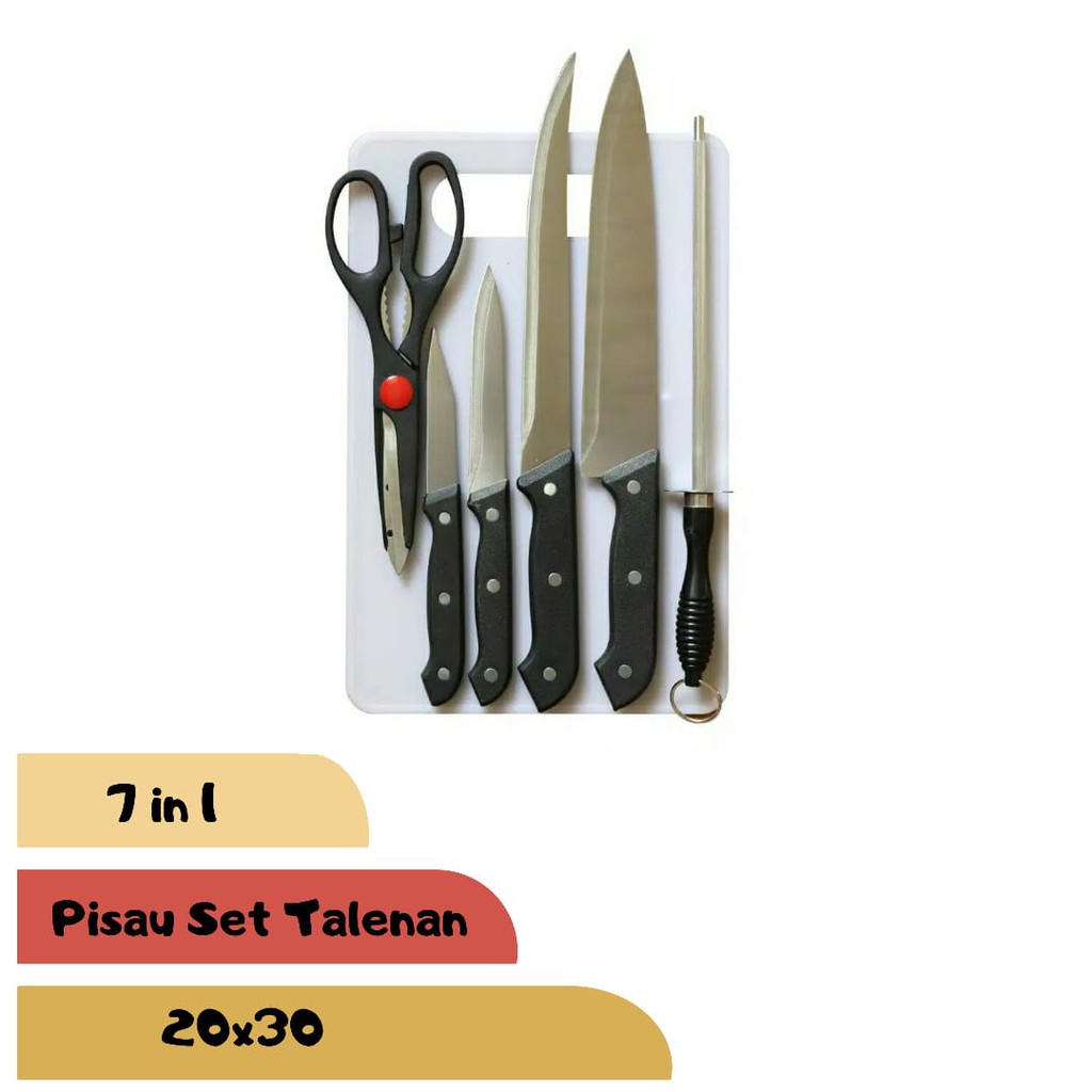 Set Pisau Dapur 7 in 1 Pisau dapur yang tajam dan sudah tidak perlu diasah untuk segala kebutuhan potong di dapur Anda. Serbaguna dengan 5 macam Pisau1 buah pengasah , 1 buah gunting, dan 1 buah talenan (tatakan). Sangat cocok untuk kebutuhan ibu rumah tangga, restoran dan professional. Pisau Anti Karat,Mudah Dibersihkan,dan Kuat.SPESIFIKASI Material Bilah Pisau : Stainless Steel Food Grade Material Handle Pisau : Plastik Food Grade Material Talenan : Plastik Food Grade 1 Buah - Pisau Kupas Buah (18,5cm)1 Buah - Pisau Ikan (33cm)1 Buah - Pisau Daging (33cm)1 Buah - Pisau Serbaguna (22cm)1 Buah - Asahan Pisau (28cm)1 Buah - Gunting Dapur ( 22cm)1 Buah - Talenan / Tatakan (29x