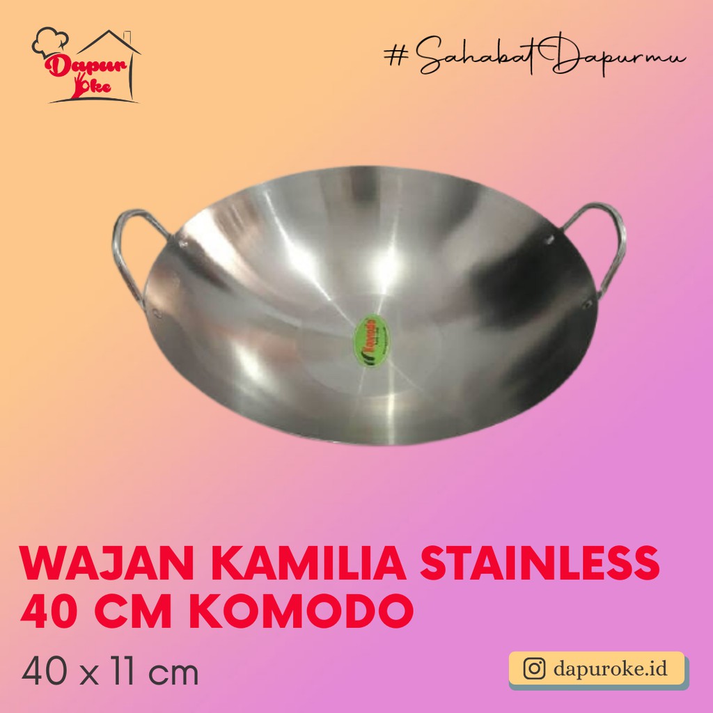 Kuali Kamilia Stainless 40 cm KomodoBahan : stainless tebalWarna : Silver stainless steelBrand : Komodo ProductDimensi : 40 x H 11 cm ( tanpa handle )Tinggi Handle 5 cmWajan untuk menumis, menggoreng tidak lengket tapi bukan anti lengketTOLONG DIBACA DULU YA- Pengiriman maksimal H+1. Orderan yg masuk hari sabtu dikirim senin karenasabtu buka setengah hari. Minggu & Tgl Merah LIBUR.- Dikirim DIHARI YANG SAMA apabila orderan masuk sebelum JAM 10 PAGI.- Order bubble wajib untuk barang yang mudah pecah untuk garansi kembali barang.- Tulis diKETERANGAN apabila ada request WARNA atau JENIS untuk tidak dikirimRA
