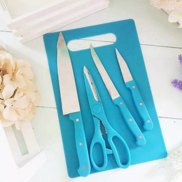 Talenan Set 5 pcs Pisau Dapur pisau roti pisau daging guntingCutting Board Set / Telenan set 5 pcscutting board sett ini 1 pack terdiri dari :1 Telenan Ukuran Besar1 Pisau Daging/pisau dapur1 Pisau Kupas Buah/sayur1 Pisau Roti1 Gunting SayurACT BUBBLE WRAP supaya barang lebih Safety Saat PengirimanMerupakan peralatan dapur dalam hal masak memasak,telenan merupakan alat tatakan/landasan untuk melakukan pengirisan bumbu-bumbu dapur,sayur,daging,buah,dllDimensi masing-masing produk- Bahan plastik Bertulang- Telenan Besar uk .29 x 19 cm- pisau Daging/pisau dapur Stainless Uk 28cm- Pisau Kupas buah/sayur Stainless uk : 23 cm- Pisau Roti Stainless uk : 19 cm- Gunting sayur stainless uk : 20 cm- Berat : 200 grm Telenan dilengkapi Lubang pegangan bisa di gantungkan saat tidak digunakan,bagian atas telenan alas kasar guna saat pengirisan mudah dilakukan tidak dicuci dan mudah disimpan,tidak menj