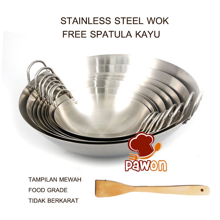 Grosir Perlengkapan di Kabupaten Kulon Progo 40cm Wok Kuali Wajan Stainless Steel Kupingan / Double Handle Free Spatula Kayu dari Tidak Ada Merek Kab. Sidoarjo