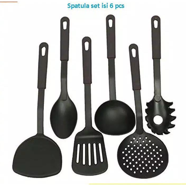 Spatula Nylon Set 6in1 Sutil HitamKitchen Tools Set 6 Pcs Black Atau Alat Masak Spatula Setketerangan:Spesifikasi :- bahan : Nylon- ukuran (L x W):- beras scoop : -29.5 cm x 6 cm/11.61 " x 2.36 "- saringan : -31.5 cm x 11 cm/12.4 " x 4.33 "- sendok sup : -30 cm x 8.5 cm/11.81 " x 3.35 "- pancake turner : -31 cm x 10.5 cm/12.2 " x 4.13 "- slotted turner : -32 cm x 7.5 cm/12.6 " x 2.95 "- bubuk steak-30 cm x 6.5 cm/11.81 " x 2.56 "Note: pengukuran menggunakan tangan, ada kemungkinan beda 1-2cm JADI WAJAR NO RETUR NO KOMPLAINPaket Termasuk:Total 6 Piece Nilon Memasak Alat Set:- 1 pc x beras scoop- 1 pc x saringan- 1 pc x sendok sup- 1 pc x pancake turner- 1 pc x slotted turner- 1 pc x bubuk steakWarna : H